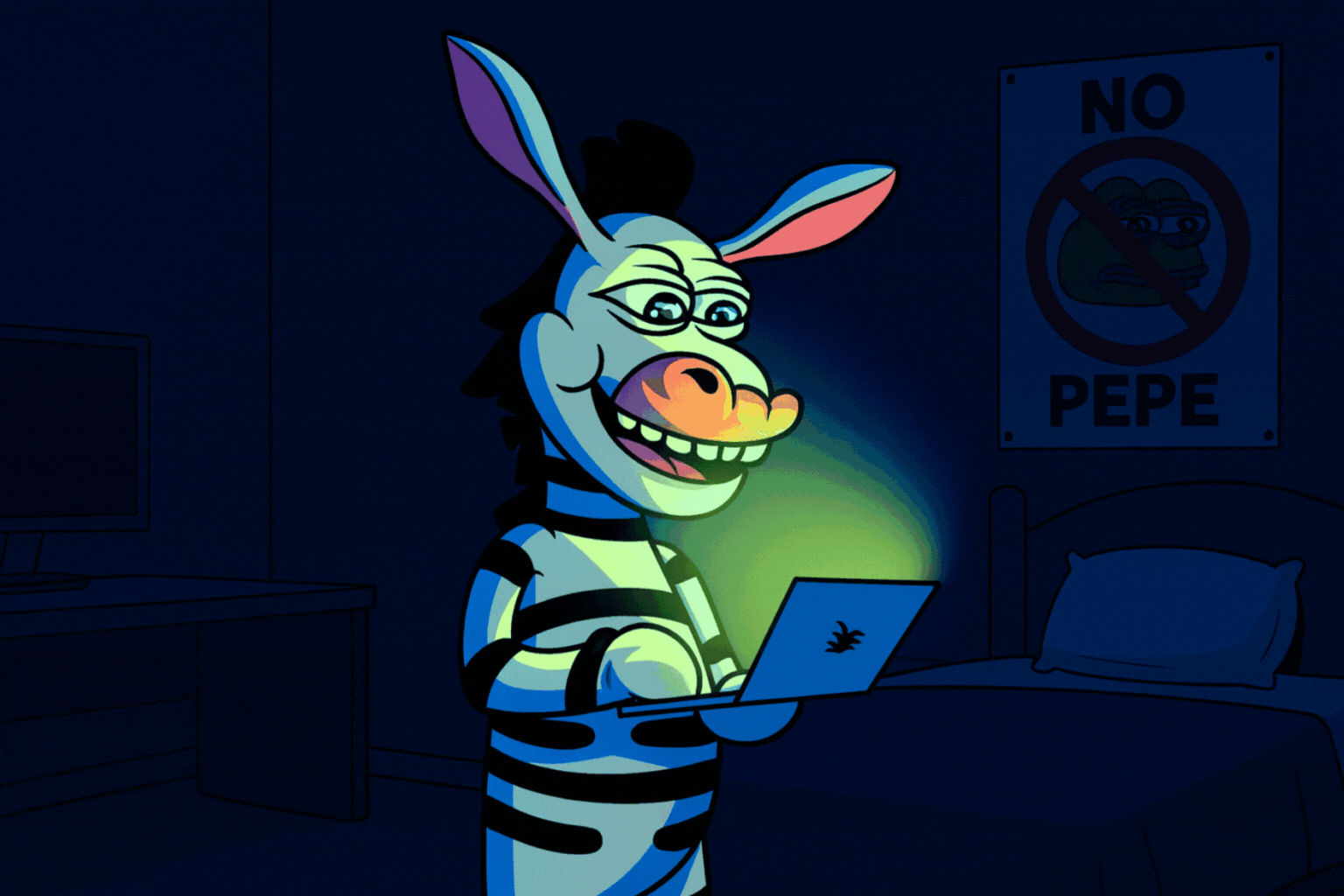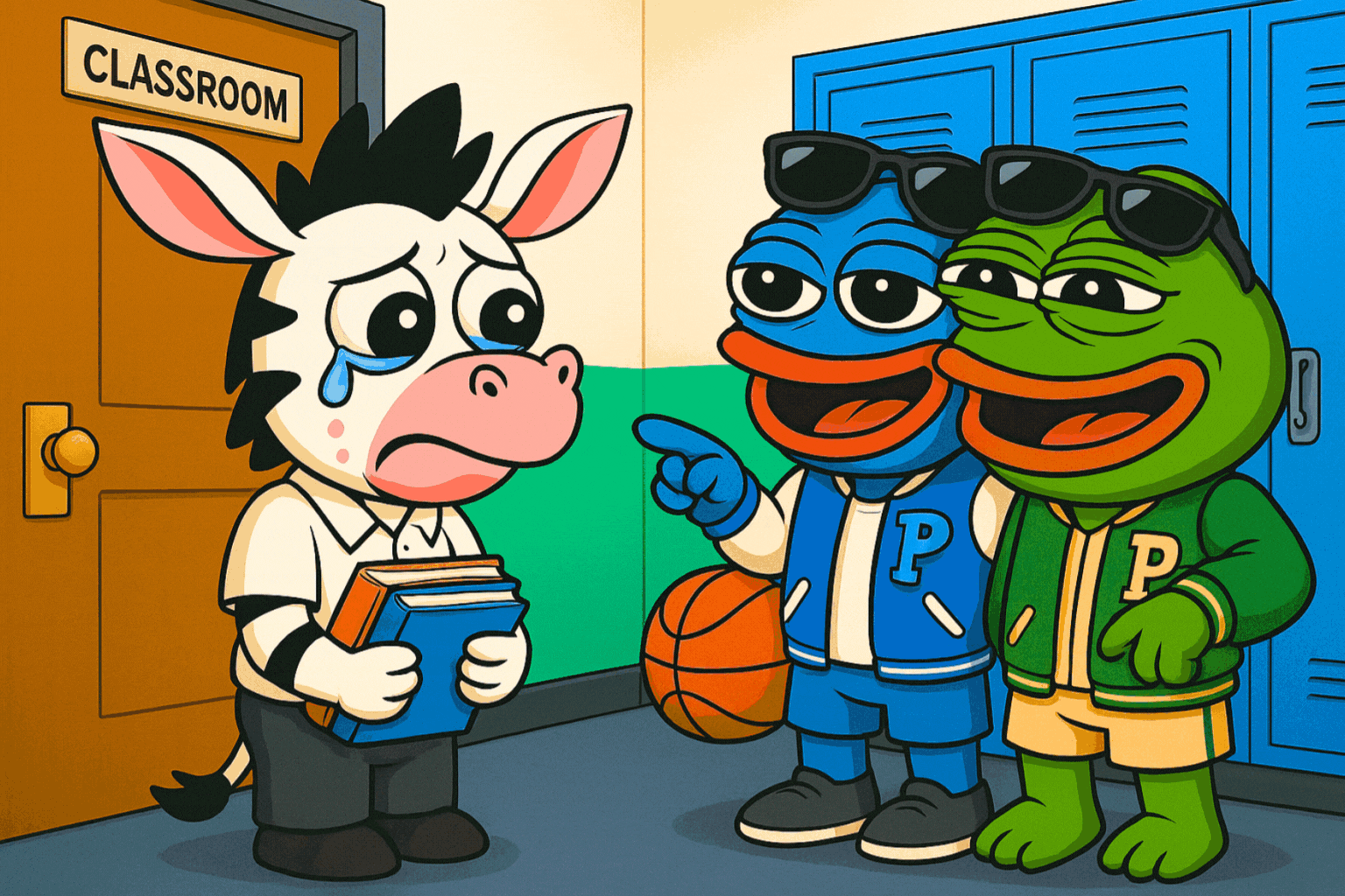 But times change… and so do frogs. One day, PEPE started to become popular. He had the jokes, the rizz, the AURA. Little ZEZE didn’t fit in anymore... his stripes became “barcodes” and he was known as the 'brokie'. The teasing turned into insults and soon the friendship faded...